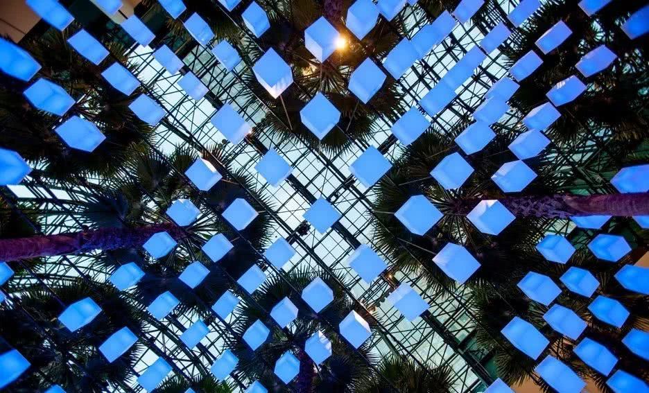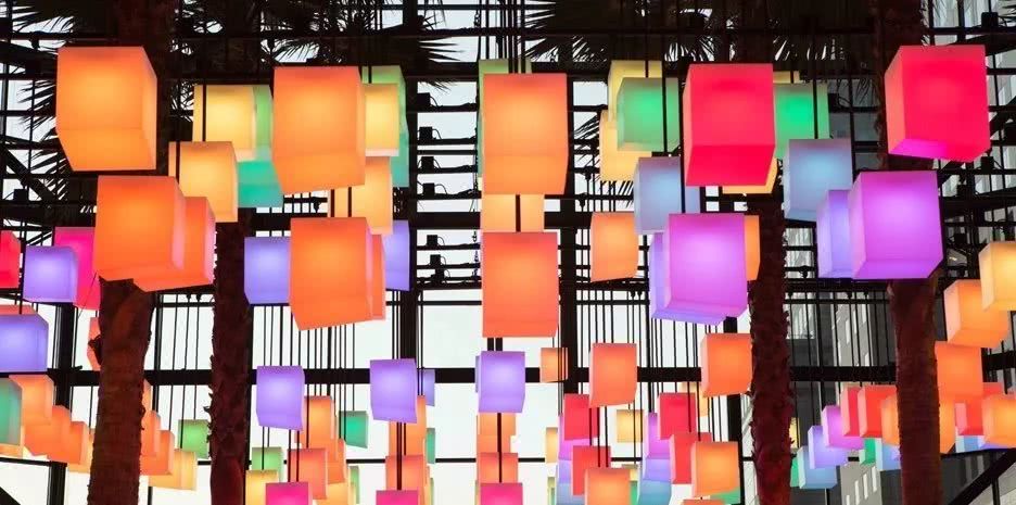 今天给大家带来的是Rockwell Group与Arts Brookfield合作设计的名为“luminaries(发光体)”的公共交互冷光展。展览设在纽约的曼哈顿下城区布鲁克菲尔德广场(brookfield place)冬景花园的中庭处,多排内置LED灯的正方体布面灯笼悬挂在宽敞的中庭上空,分别在白天与黑夜发出不同颜色不同亮度及不同动态感的光。