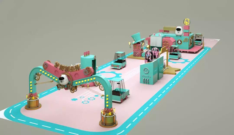 争气鼠IP主题美陈装置—国风幻想,打造一场的独有的中式蒸汽朋克风,将机械美学的硬派怀旧主义、浪漫主义、想象力与国风嫁接,场景里蒸汽朋克符号和内容运用设计语言衔接在中国古典元素上,让一个架空的魔幻世界在真实空间中呈现。