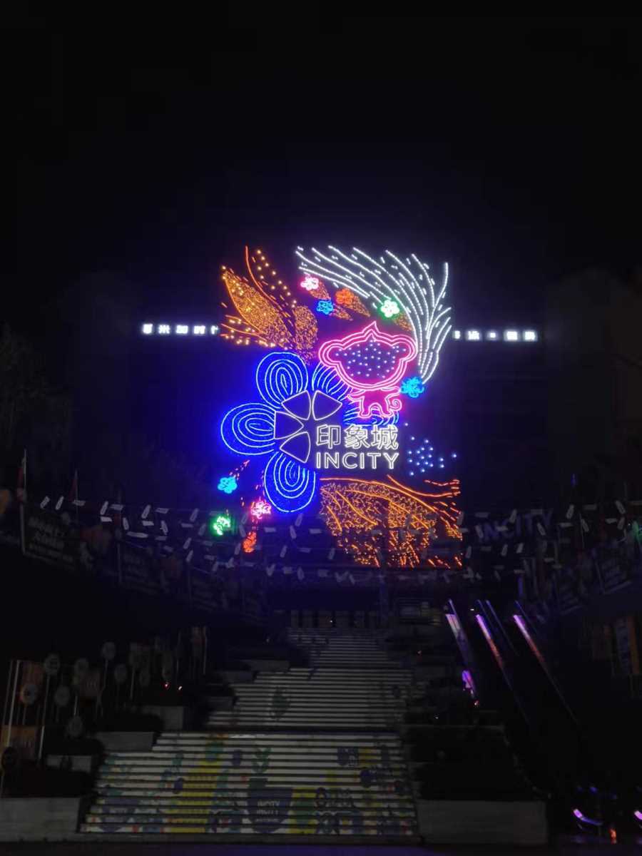 这是我们给贵阳印象城玻璃幕墙做的灯饰画,采用隐形设计,以双向拉升阻燃网做底网,用格林曼品牌柔性彩虹管绘制画面。